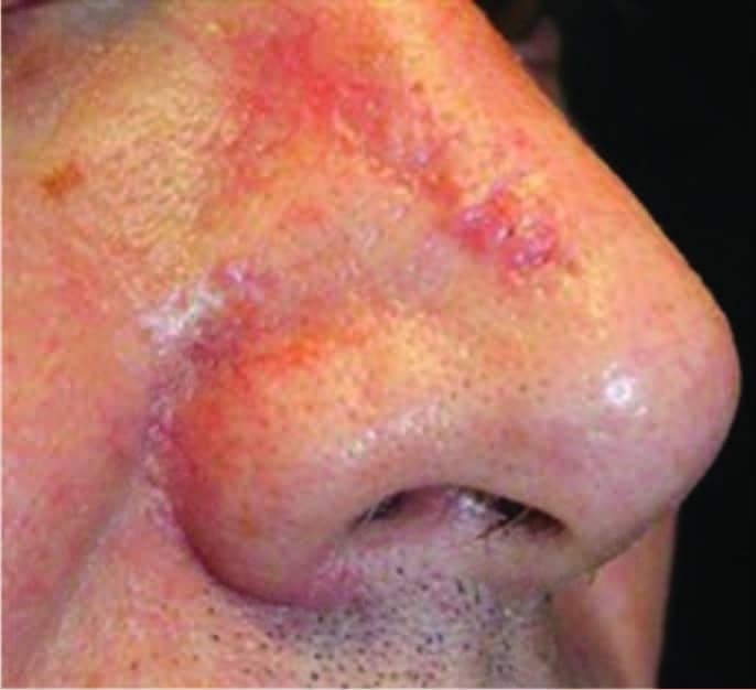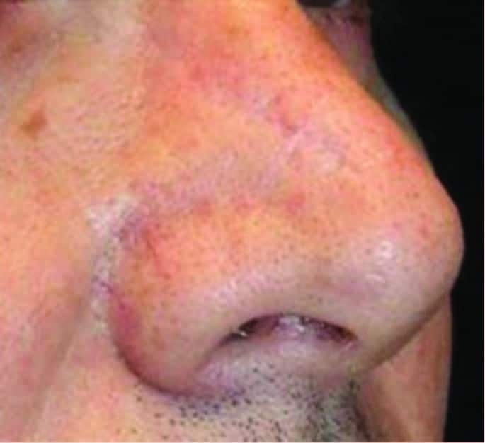 Surgical scar on the nose before (left) and 6 months after (right) two microneedling treatments. Global Assessment Score = 4.
